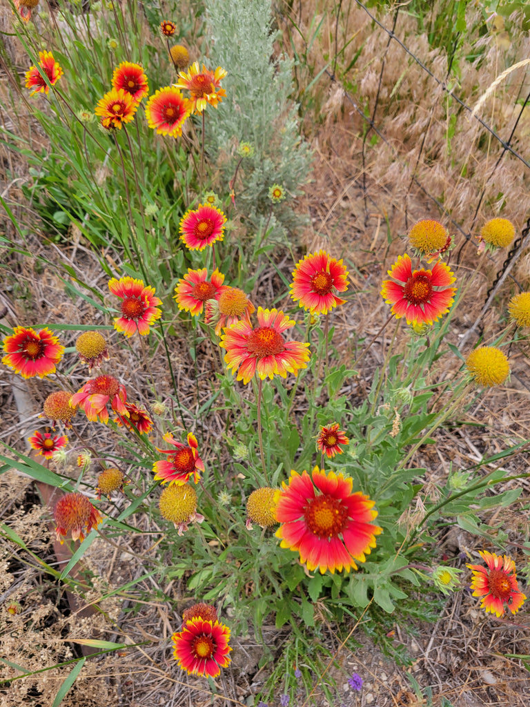 One of our favorites for difficult spots, these hardy flowers do excellent in poorer soil and roadside plantings. This native perennial flower is very attractive to bees and other beneficial insects and is found in most of the Western United States, great lakes region, New England, and upper great plains. Firey flowers are a great addition to xeriscaping, low-water/no-water gardens and borders. Flowers early in mid-June and will do so until frost, especially of dead-headed. Leaves fuzzy. A bit of its story: The plant genus Gaillardia was dedicated in 1788 in honor of the early French botanist Gaillard de Charentonneau. The plant species Aristata means "bearing bristles" in botanical Latin, in reference to the rough hairy leaves and stems. The cryptic blanketflower moth, Schinia masoni evolved with Gaillardia artistata and bears color patterns allowing it to blend in with the flower heads and remain unseen during the day. The head and thorax of the moth blend in with the yellow center of the flower, while the wings are red to blend with the petals. The wing tips are yellow, just as the petals are yellow at the tips. The blanketflower moth is found in Colorado and Wyoming. Check out more about the Blanketflower moth here. How to grow it:
