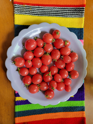 Solanum lycopersicum We are just getting into micro-dwarf tomatoes. They are so fun to grow in the ground or in containers, and are a great addition to a children's garden. These pink fruit are so cute, and are a tangy nutritious addition to salads. Not as tiny as our Rosy Finch Micro-dwarf, these pink poppers grow on plants that get about 18 inches tall and don't need trellising, but a little "propping" with stakes will help keep the abundant fruit from contacting the ground. Easy to grow and widely adapted. How to grow it: