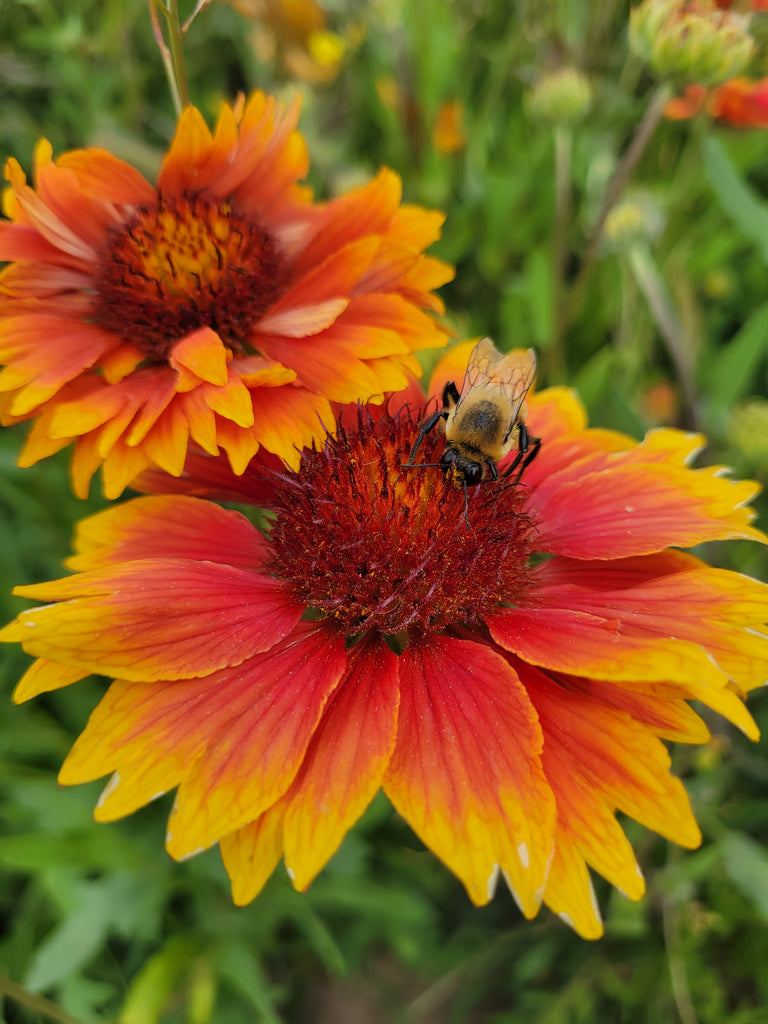 One of our favorites for difficult spots, these hardy flowers do excellent in poorer soil and roadside plantings. This native perennial flower is very attractive to bees and other beneficial insects and is found in most of the Western United States, great lakes region, New England, and upper great plains. Firey flowers are a great addition to xeriscaping, low-water/no-water gardens and borders. Flowers early in mid-June and will do so until frost, especially of dead-headed. Leaves fuzzy. A bit of its story: The plant genus Gaillardia was dedicated in 1788 in honor of the early French botanist Gaillard de Charentonneau. The plant species Aristata means "bearing bristles" in botanical Latin, in reference to the rough hairy leaves and stems. The cryptic blanketflower moth, Schinia masoni evolved with Gaillardia artistata and bears color patterns allowing it to blend in with the flower heads and remain unseen during the day. The head and thorax of the moth blend in with the yellow center of the flower, while the wings are red to blend with the petals. The wing tips are yellow, just as the petals are yellow at the tips. The blanketflower moth is found in Colorado and Wyoming. Check out more about the Blanketflower moth here. How to grow it: